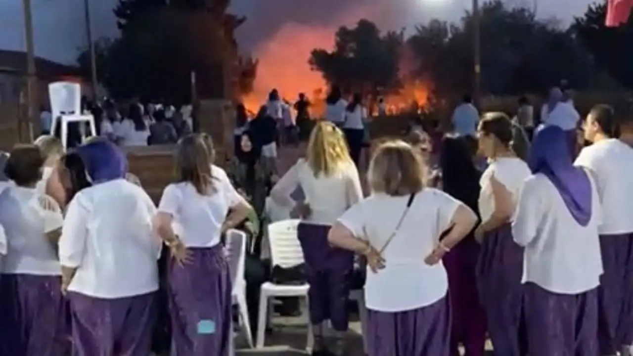 Bursa'nın Karacabey ilçesindeki şalvar gecesi etkinliğinde atılan havai fişekler yangına neden olarak köyde paniğe yol açtı.