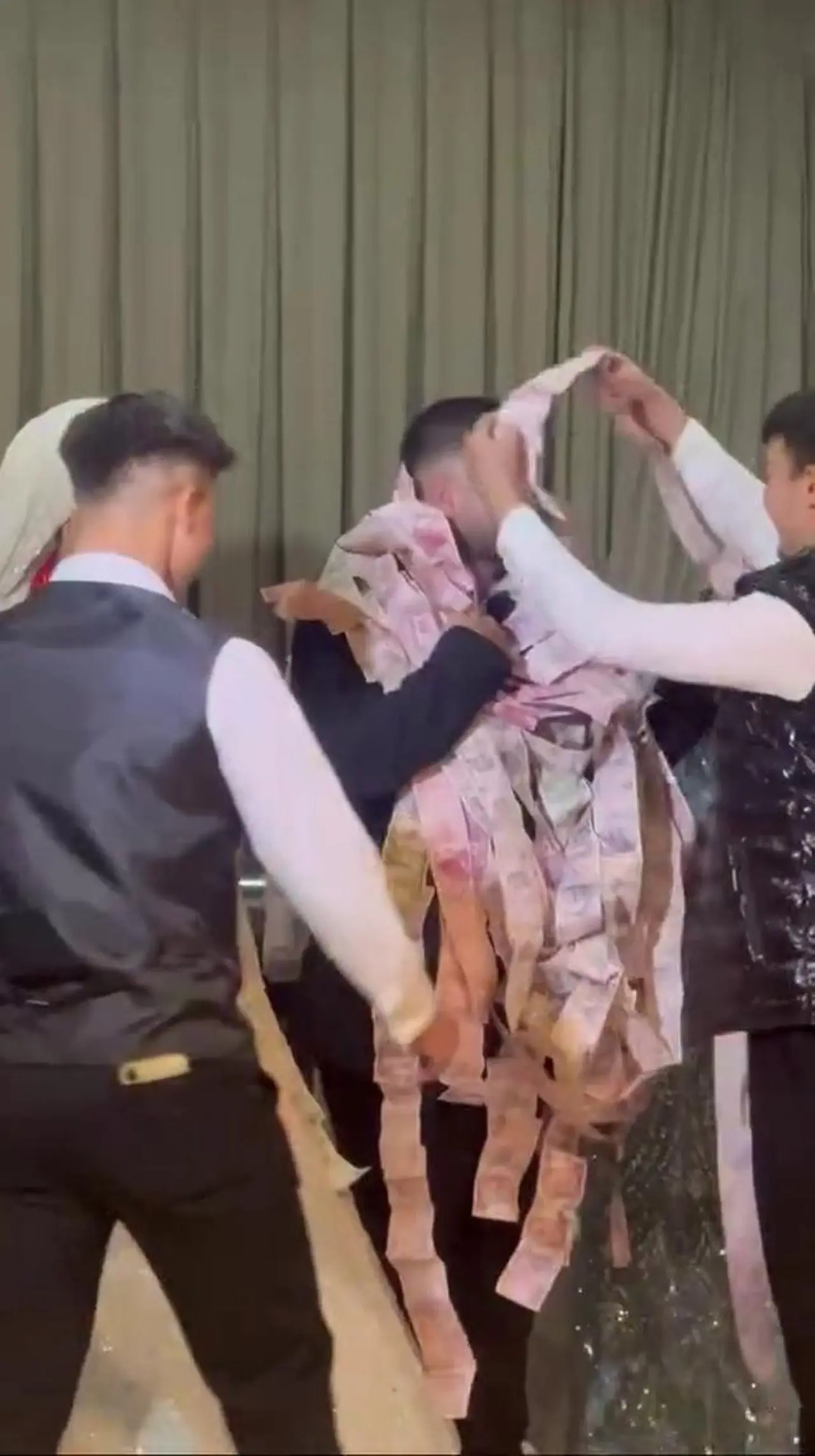 Damadın üzerine dolanan para şeridi davetlilerin ilgi odağı oldu. Bazı konuklar bu anları cep telefonlarıyla kaydetti.