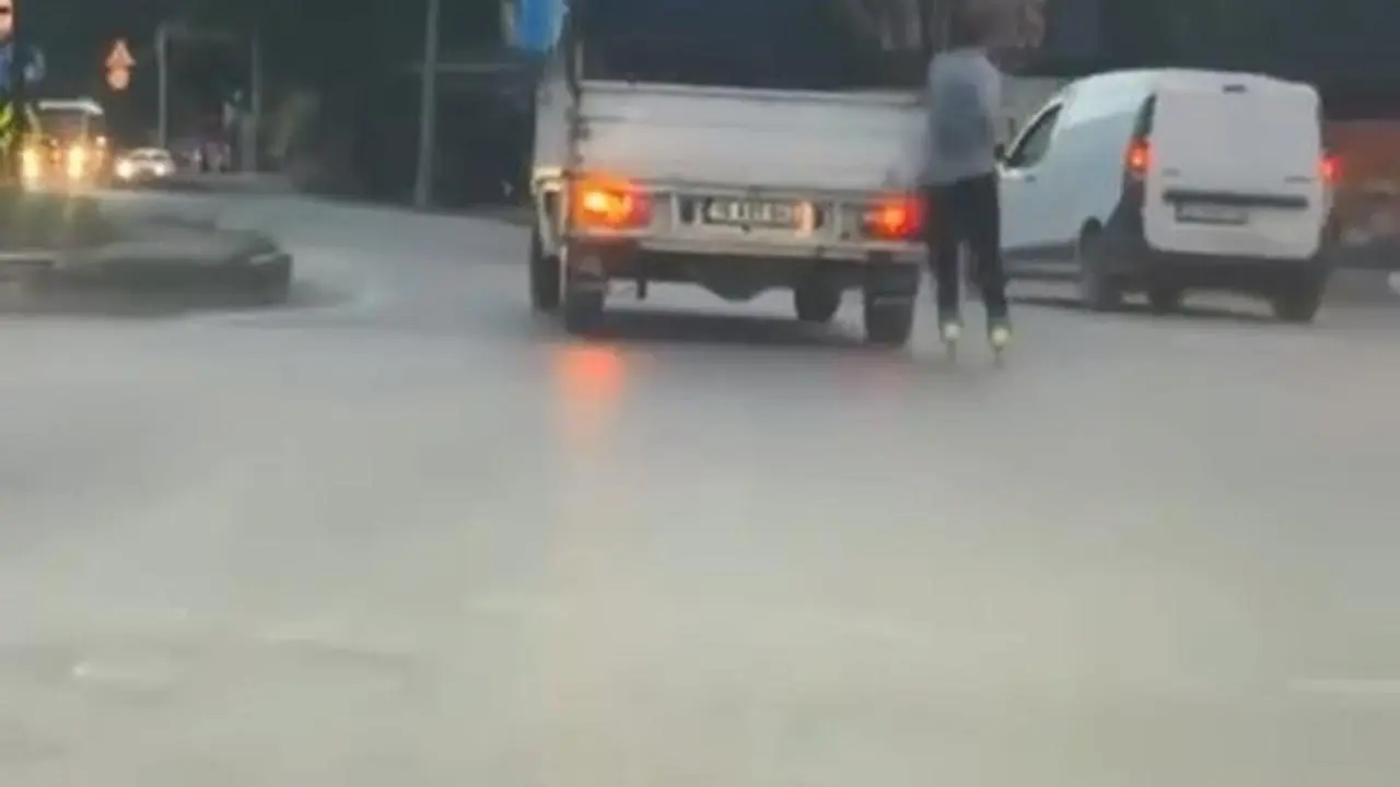 Olay merkez Nilüfer ilçesinde gerçekleşti. Patenli genç, hareket halindeki kamyonetin arkasına tutunarak tehlikeli bir yolculuğa çıktı.