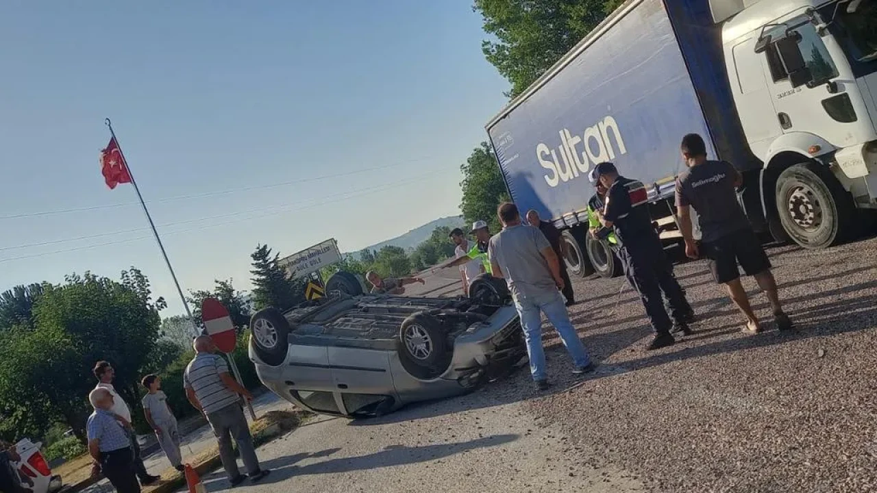 Bursa'nın İnegöl ilçesinde kamyonla çarpışan otomobil takla attı, 1'i çocuk 5 kişi yaralandı.