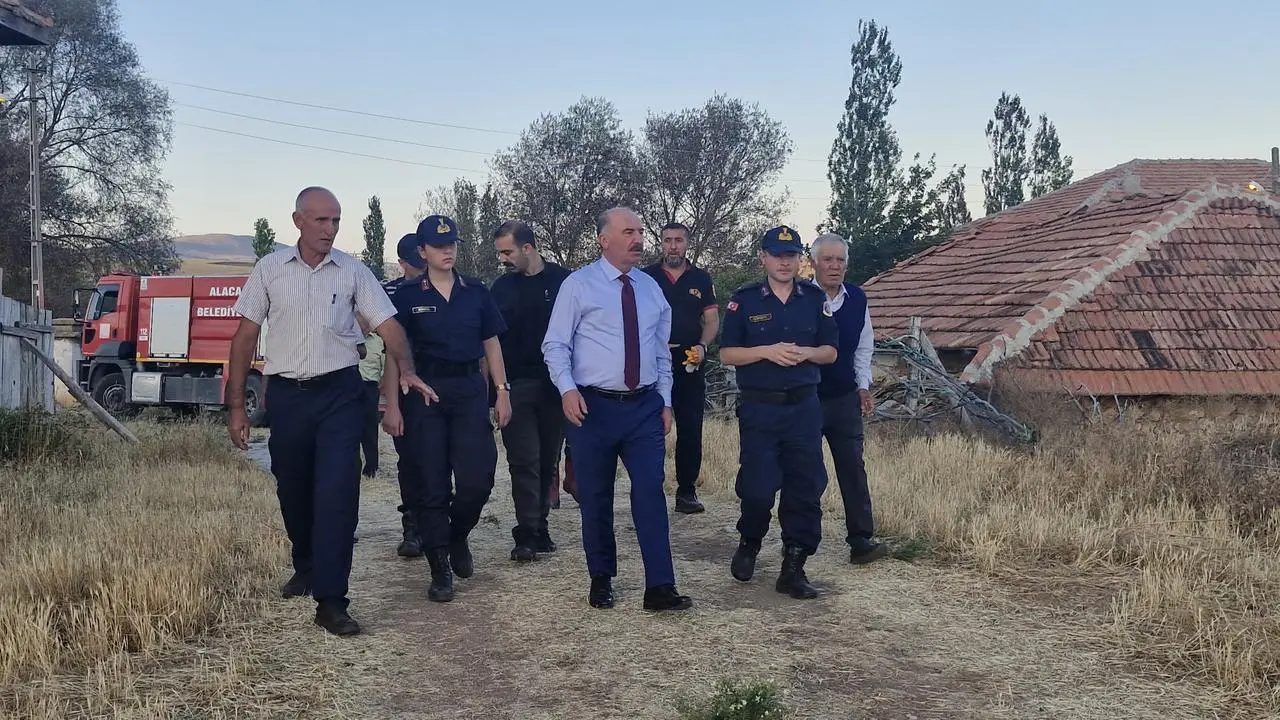 Çorum'un Alaca ilçesinde çıkan yangında üç ev hasar görürken, 160 dönüm tarım arazisi ve mera alanı zarar gördü.