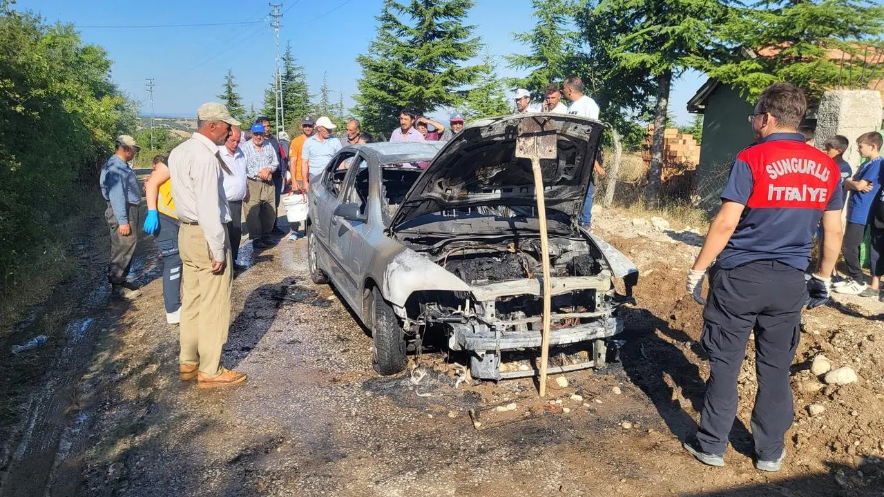 Çorum'un Sungurlu ilçesinde park halindeki bir araç aniden alev alarak tamamen yandı.