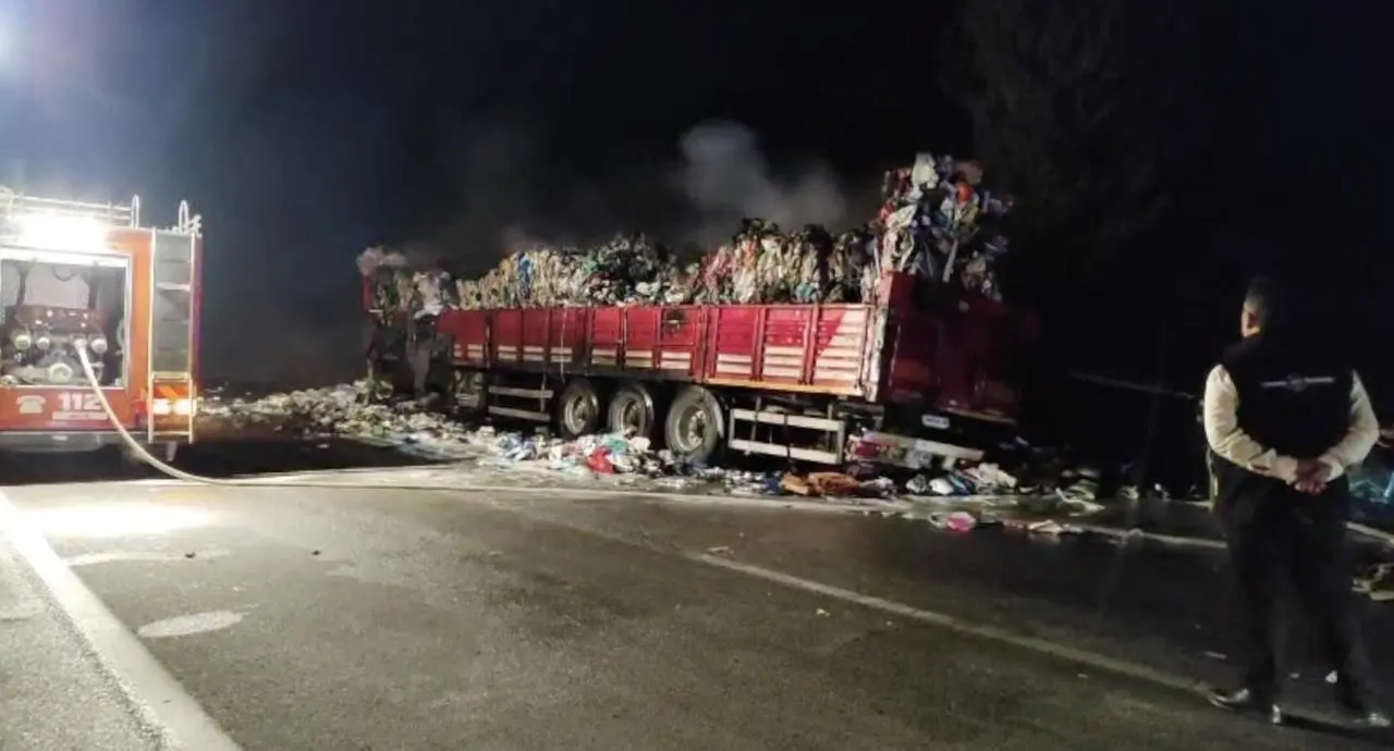 Çorum'da seyir halindeki çöp yüklü tırın dorsesinde yangın çıktı, itfaiye ekipleri müdahale ederek yangını söndürdü.
