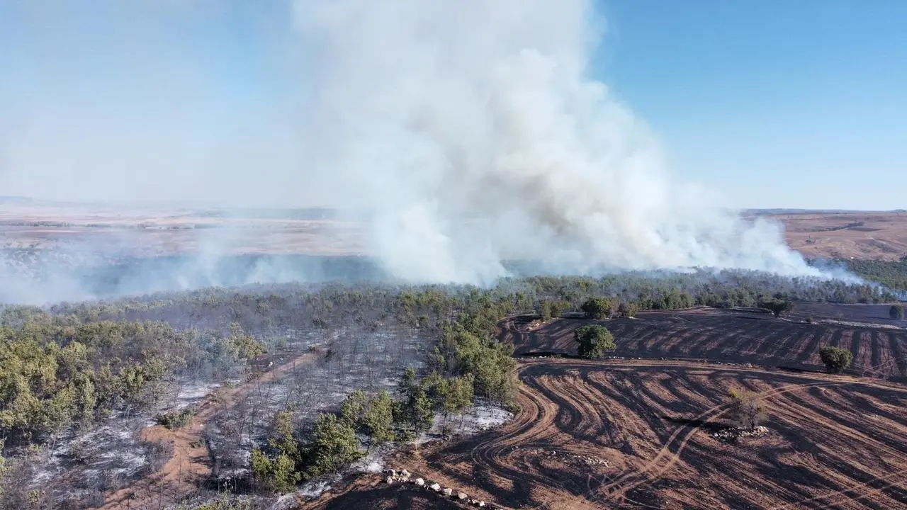 Çorum'un Alaca ilçesinde tarım arazisinde çıkan yangın, rüzgarın etkisiyle ormanlık alana sıçradı.