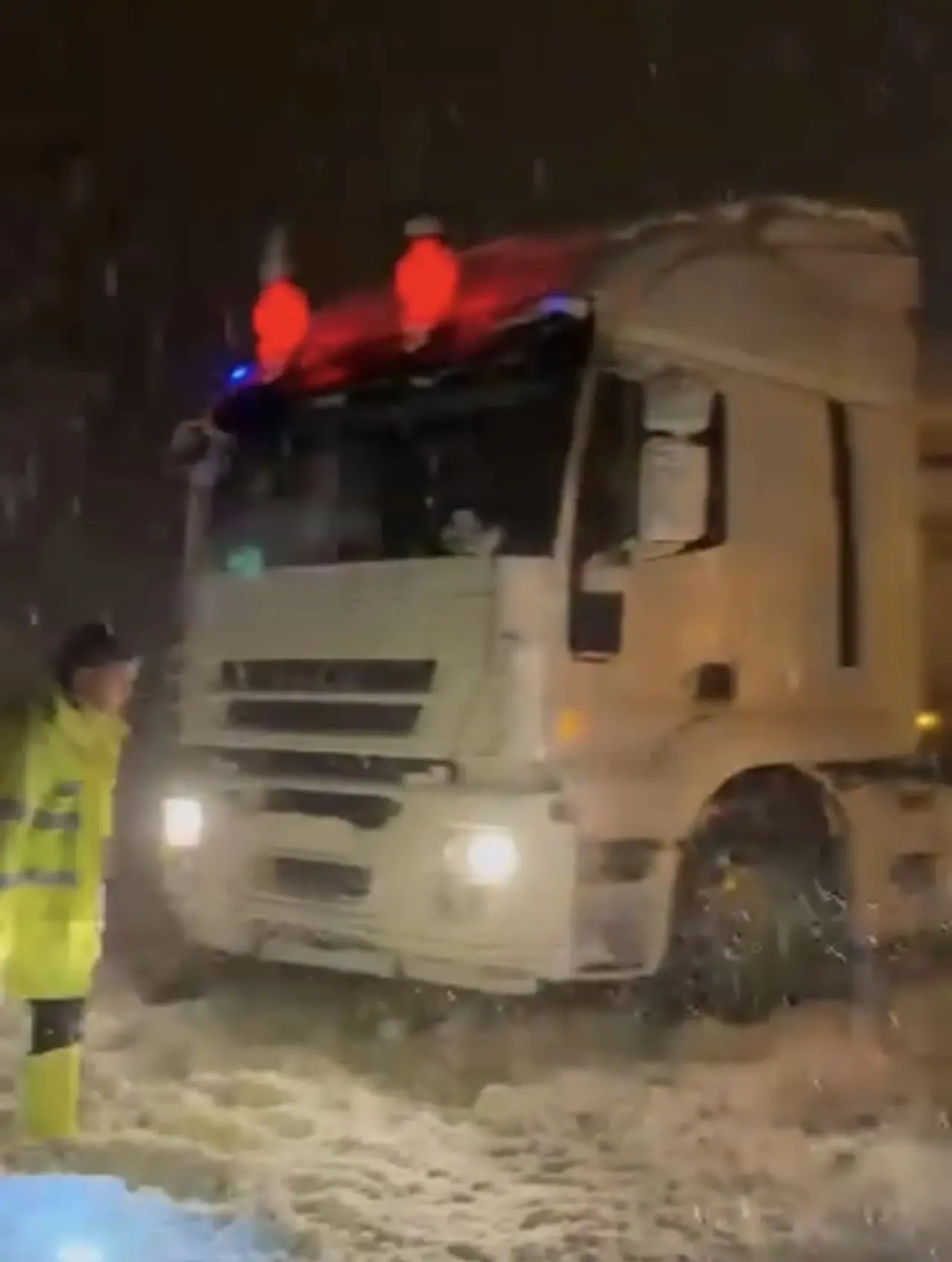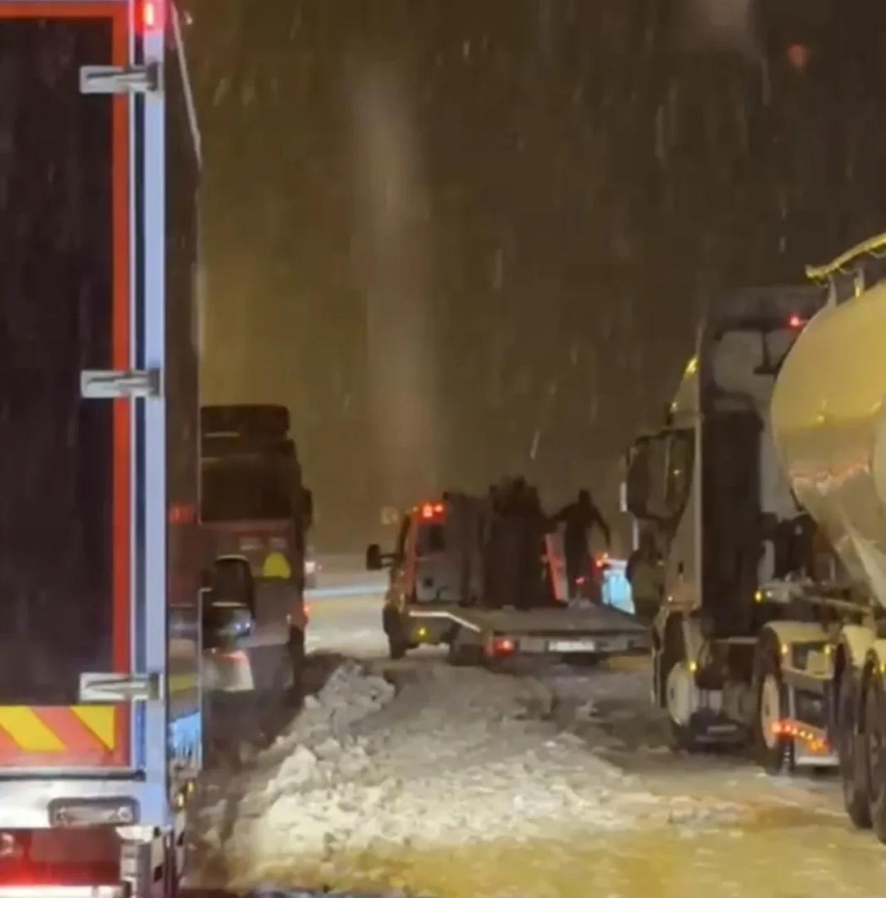 Düzce'de yoğun kar yağışı nedeniyle tırlar makasladı, ulaşım aksadı.