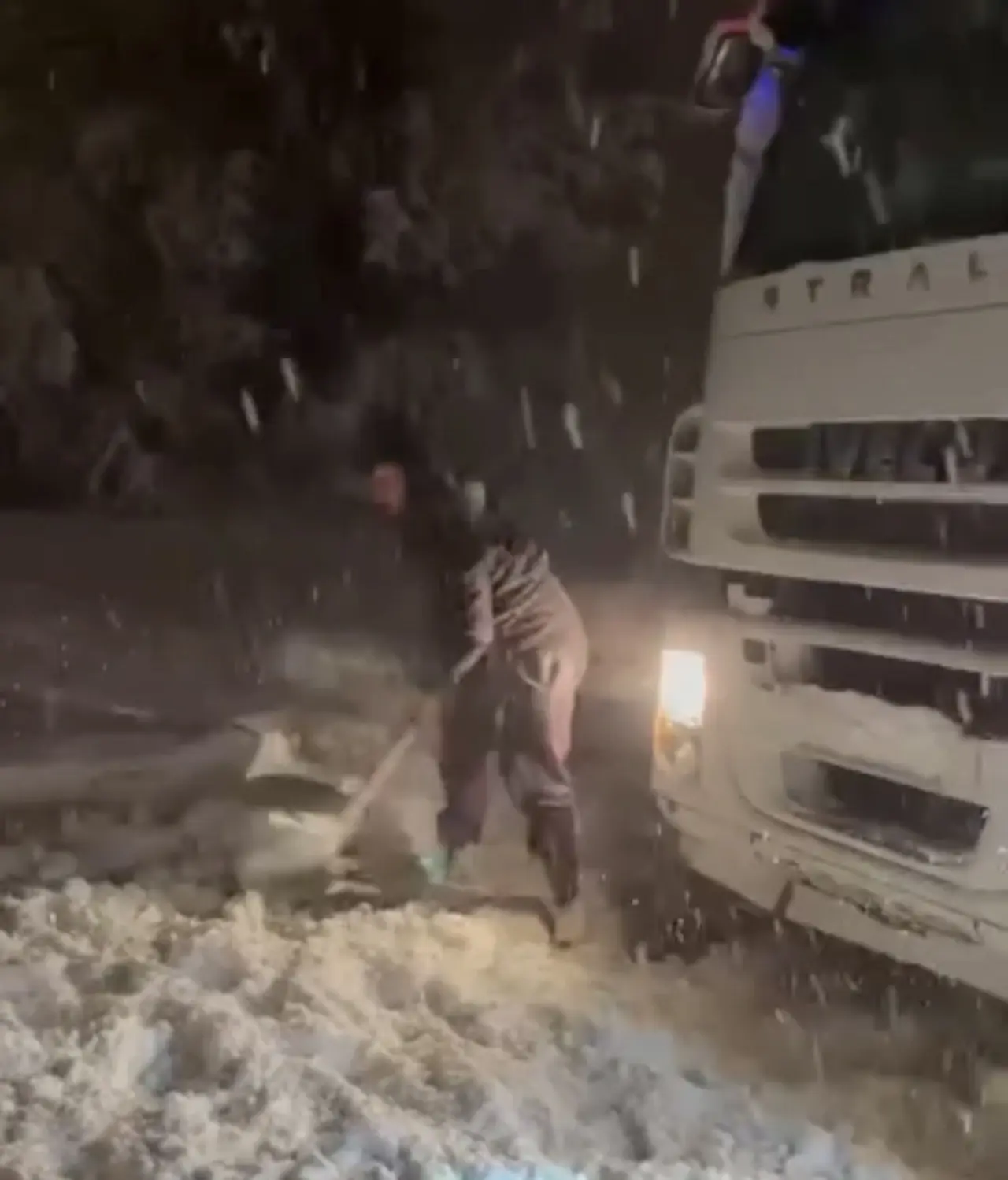 D-655 karayolunda yardıma giden çekici aracı karda mahsur kaldı. Vatandaşların desteğiyle araç kurtarıldı, anlar cep kamerasına yansıdı.