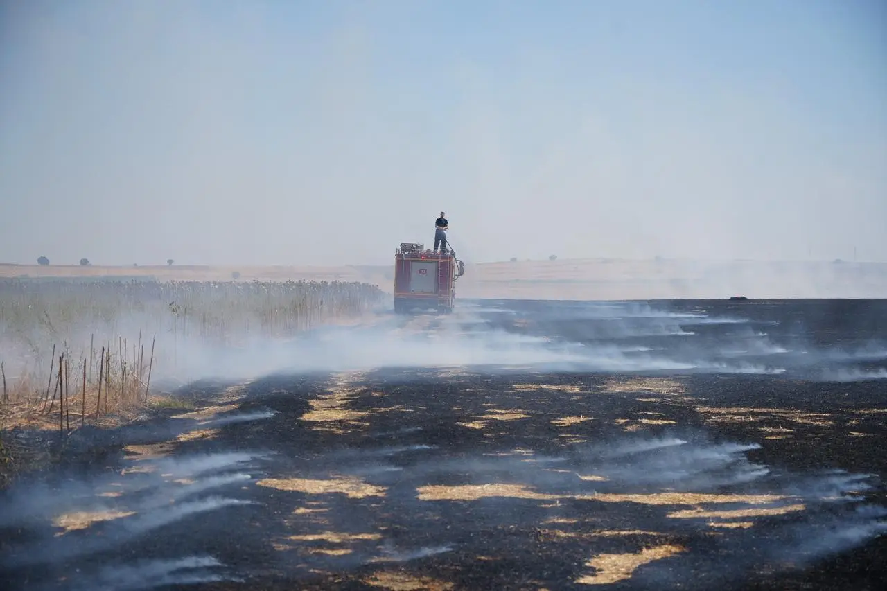 Soğutma çalışmalarının sürdüğü bölgede yangın sebebi araştırılıyor. Çiftçilerin hasat döneminde dikkatli olması yetkililerce vurgulandı.