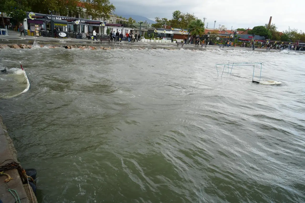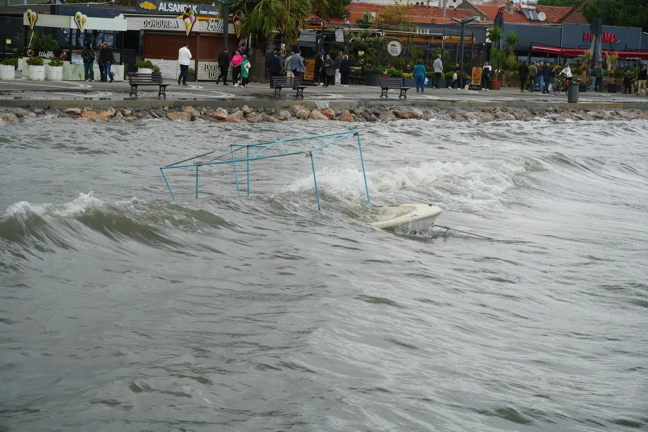 Fırtına saatte 70-80 kilometre hıza ulaşarak dev dalgalar oluşturdu. Güre Mahallesi Sahili'ndeki tekneler dalgalara dayanamadı.