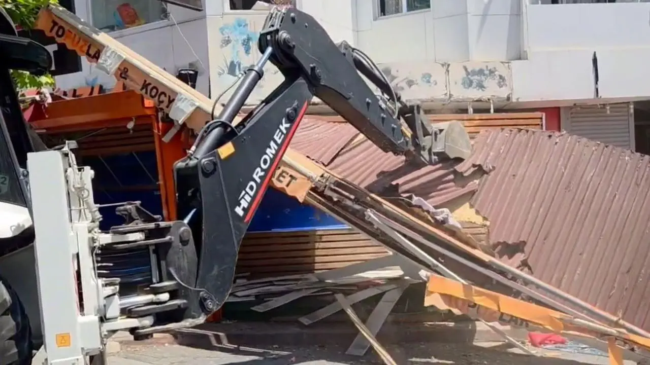 Zabıta ekipleri, polis ve çevik kuvvet eşliğinde markete gelerek yıkım işlemini başlattı. Kepçe kullanılarak marketin kaldırıma taşan manav reyonu yıkıldı.