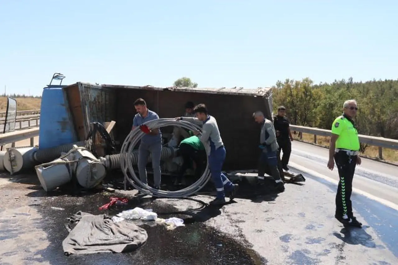 Devrilen kamyonun trafosundan sızan yağ yolu kayganlaştırdı. Sürücüler zor anlar yaşarken trafik tek şeride düştü.