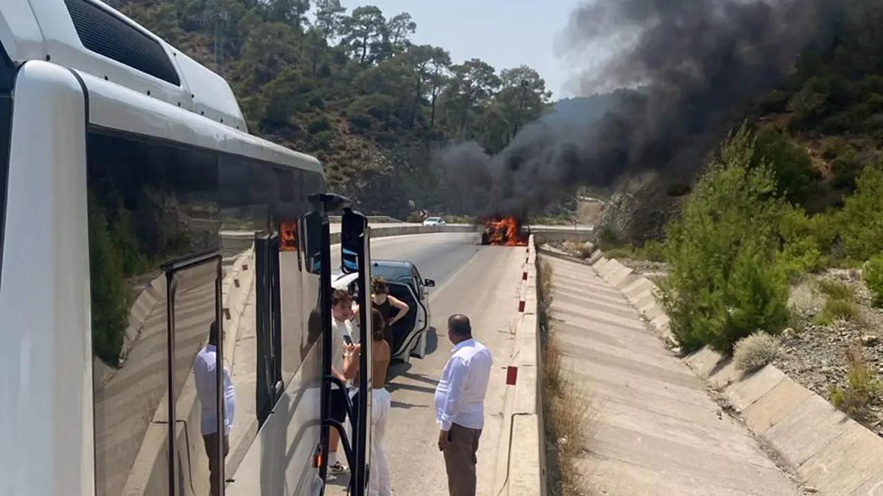 Fethiye'nin Yanıklar Katrancıtepe mevkiinde seyir halindeki araçta çıkan yangın sonucu araç tamamen kullanılamaz hale geldi.