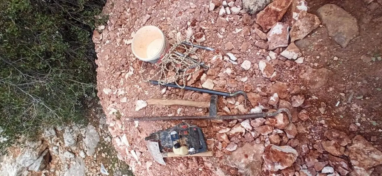 Yapılan aramalarda kazı malzemeleri ve çeşitli ekipmanlar ele geçirildi. Suçta kullanılan 5 kazı aleti, hilti, levye demiri ve diğer malzemelere el konuldu.