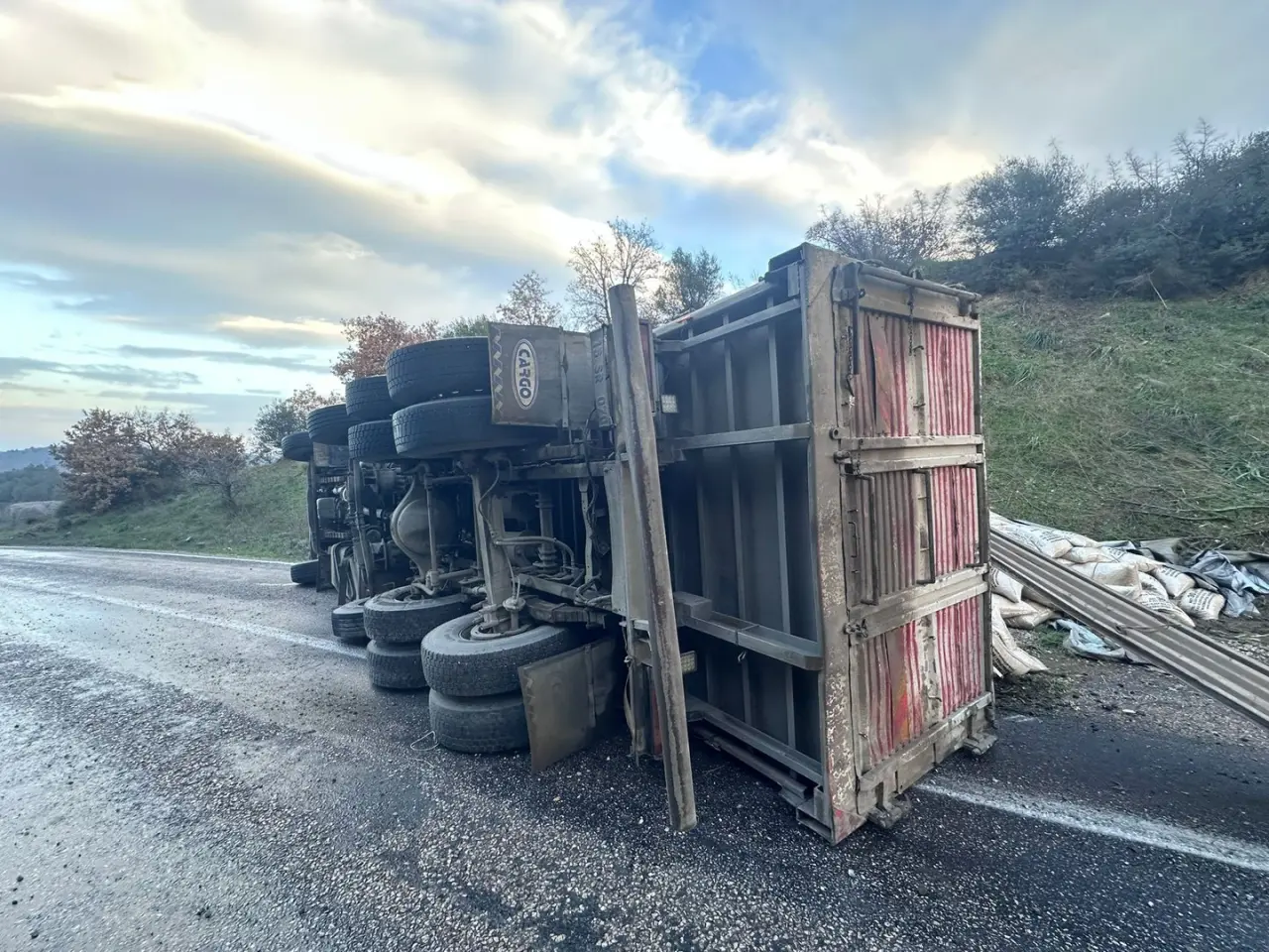 Sürücünün direksiyon hakimiyetini kaybetmesiyle devrilen kamyon yola saçılan yem torbaları nedeniyle trafiği etkiledi. Kazada can kaybı yaşanmazken araçta maddi hasar oluştu.