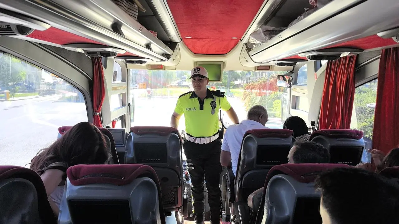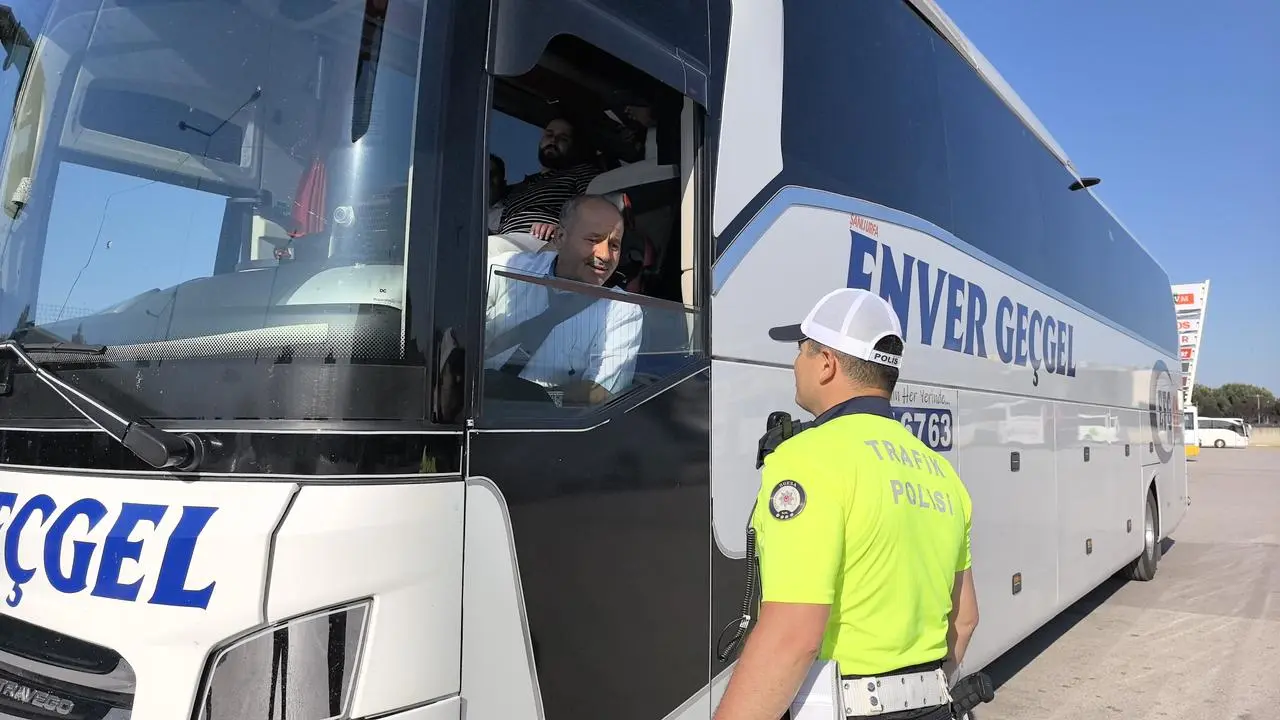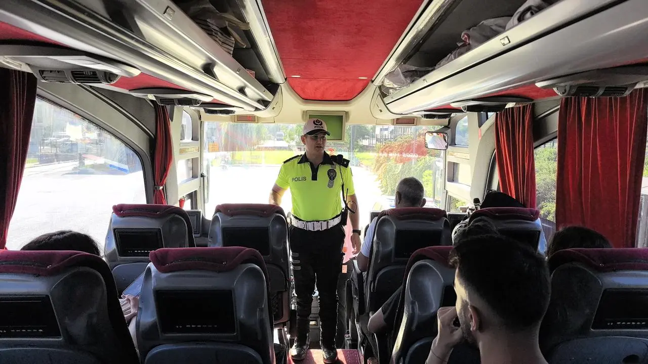Trafik ekipleri otobüs şoförlerinin evraklarını titizlikle inceledi. Kurallara uygunluk konusunda sıkı denetimler gerçekleştirildi.
