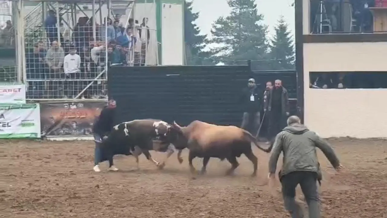 Artvin'deki geleneksel Kafkasör Festivali'nde rakibinden kaçan boğa, bakıcısını boynuzlayarak yere düşürdü.