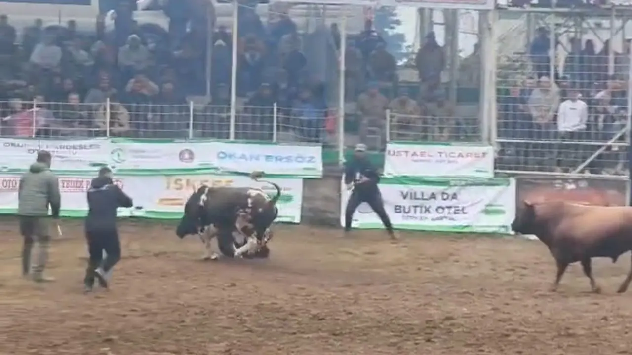 Boğanın saldırısında yere düşen bakıcı, şans eseri yaralanmadan kurtuldu. İzleyiciler yaşanan tehlikeli anları cep telefonlarıyla kaydetti.