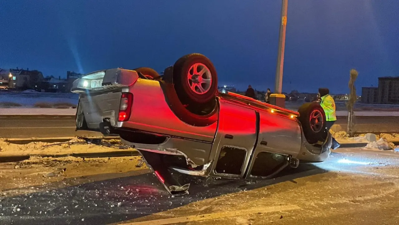 Karaman'da buzlanma nedeniyle kontrolden çıkan kamyonet refüje çarparak devrildi ve 2 kişi yaralandı.