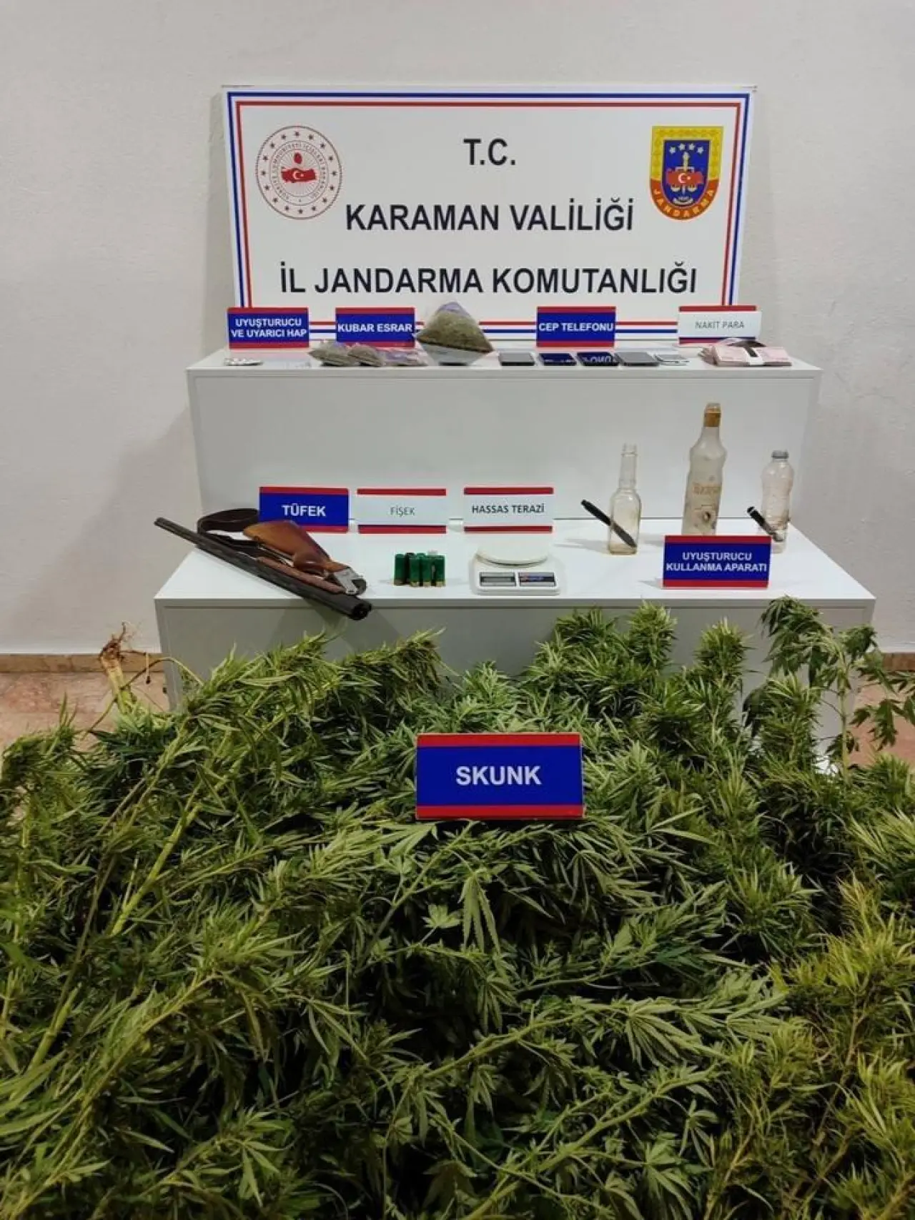 Karaman'da jandarma ekipleri, yürütülen operasyonlarda uyuşturucu, silah ve çok sayıda makaron ele geçirdi.
