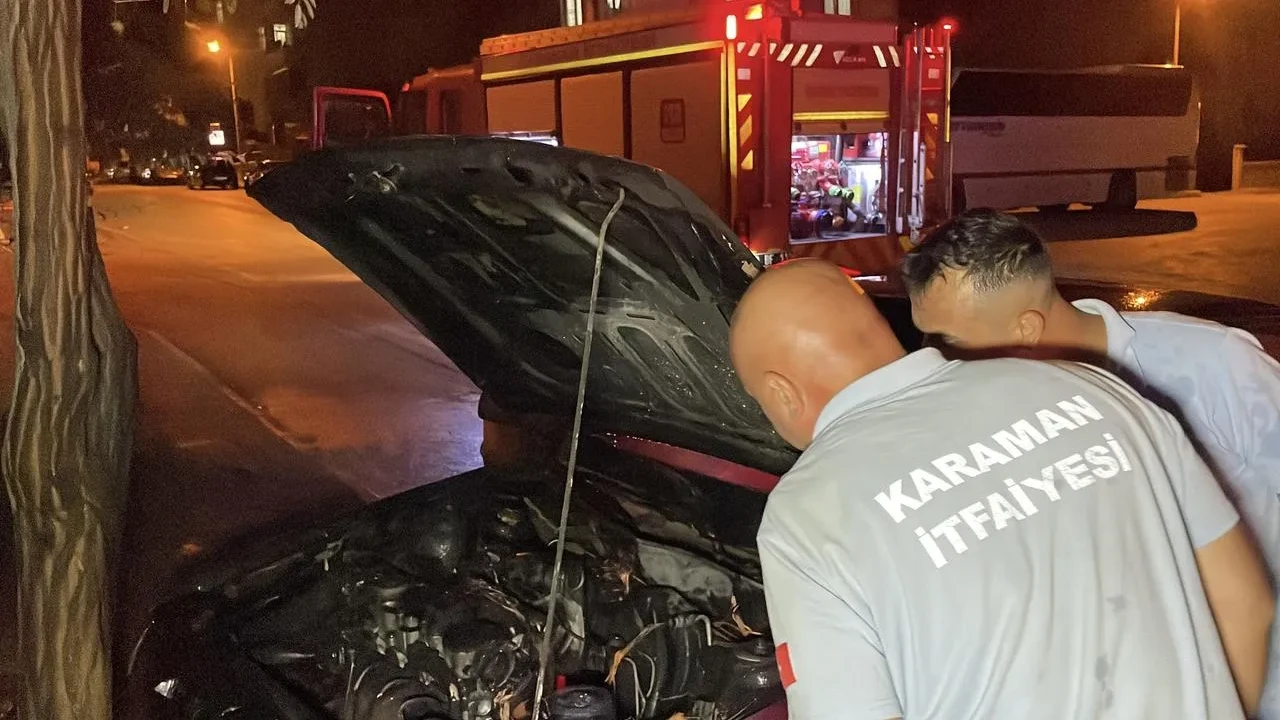 Karaman'da park halindeki otomobil kendiliğinden hareket ederek ağaca çarptı ve yanmaya başladı.