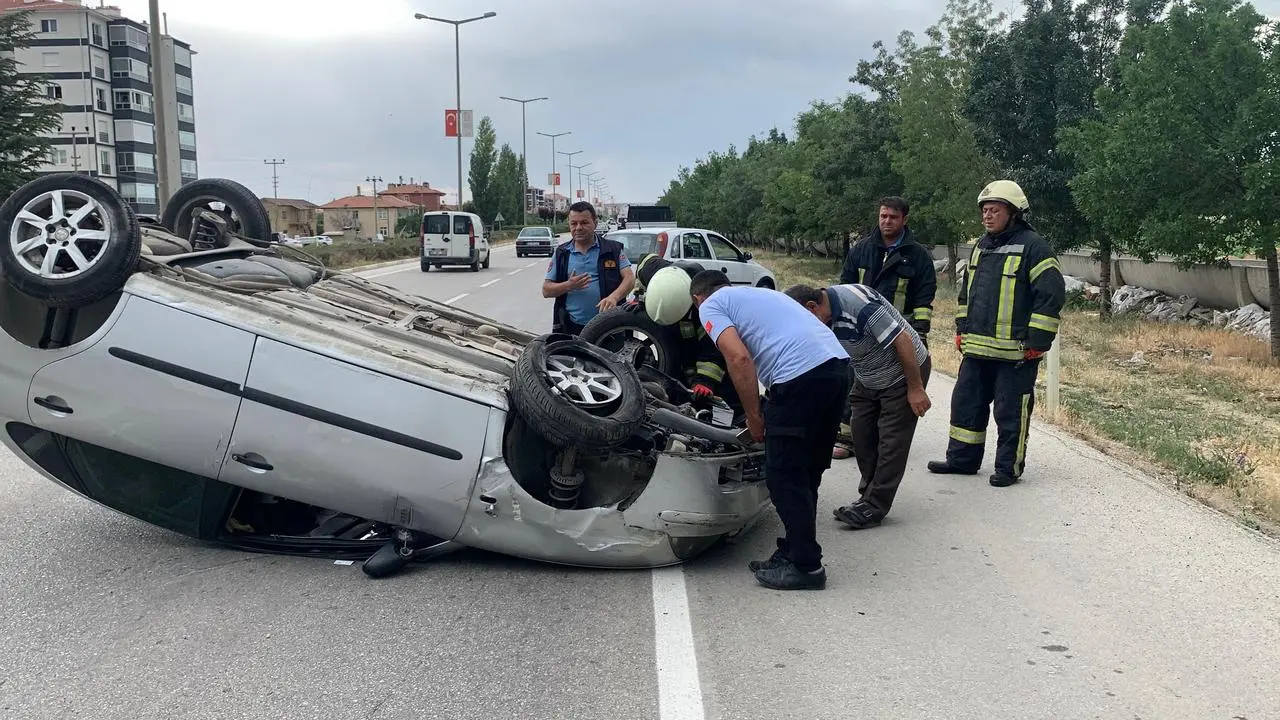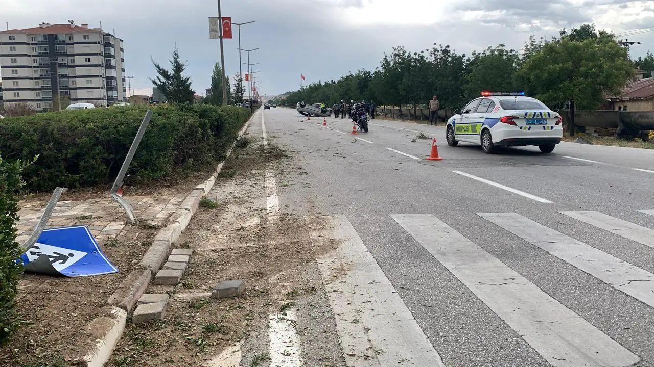 M.B.U. idaresindeki otomobil, Adnan Menderes Bulvarı'nda kontrolden çıktı. Araç orta refüjdeki trafik levhalarına çarparak takla attı.