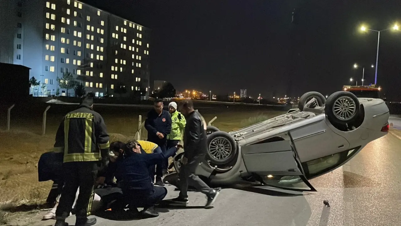 Çarpmanın etkisiyle takla atan araç ters döndü. Kazada sürücü ile bir yolcu yaralanarak hastaneye kaldırıldı.