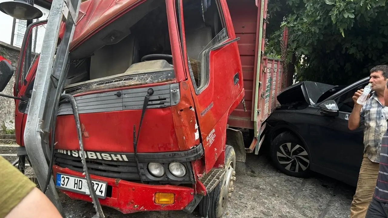 İnebolu'da kontrolden çıkan kamyon, park halindeki araca ve elektrik direğine çarparak durabildi. Kazada yaralanan olmazken, çevrede panik yaşandı.