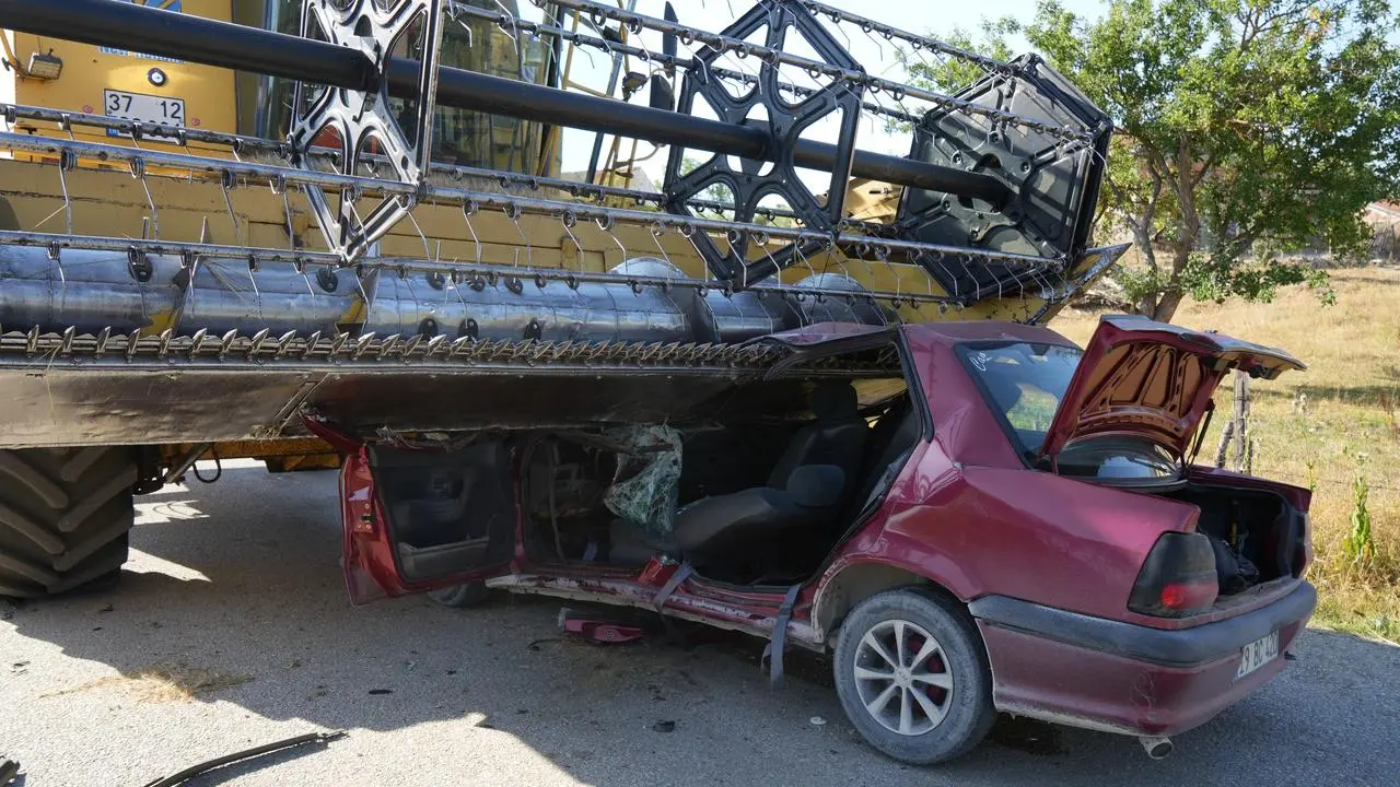 Kaza, 37 plakalı biçerdöver ile 19 plakalı otomobilin karşılıklı çarpışmasıyla meydana geldi. Şiddetli darbe sonucu otomobil yaklaşık 30 metre sürüklendi.
