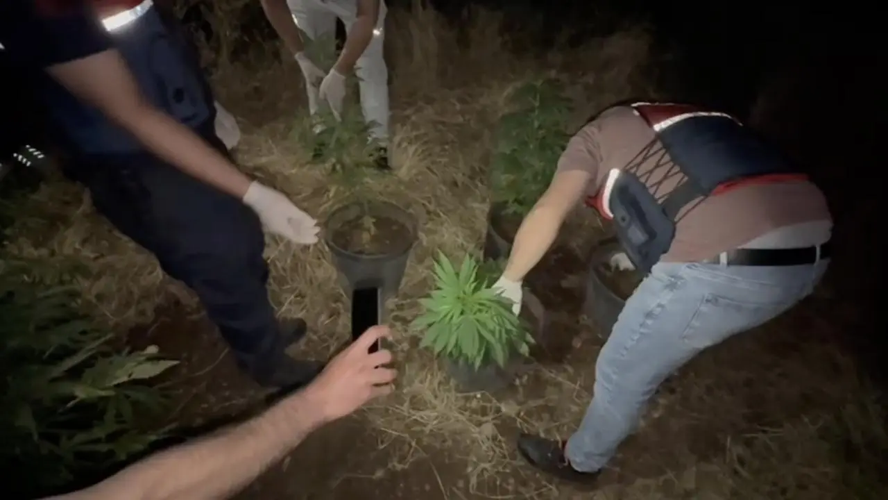 Evin balkonunda kurumaya bırakılmış 50 gram kubar esrar tespit edildi. Bahçe kısmında ise 104 kök hint keneviri bitkisi ele geçirildi.