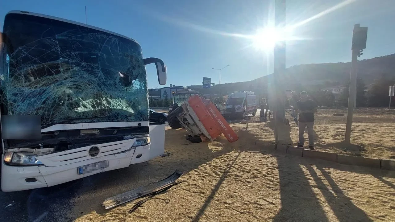Çarpışmanın etkisiyle traktörün römorku devrildi. Otobüs şoförü ve iki yolcu hafif şekilde yaralandı.