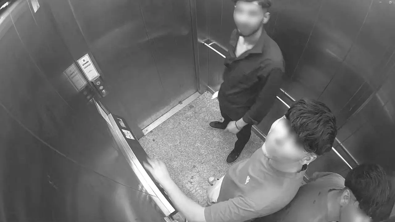 İki genç, asansör kabinindeki kamerayı köpükle etkisiz hale getirmeye çalıştı. Güvenlik kamerası, saldırı anını saniye saniye kaydetti.
