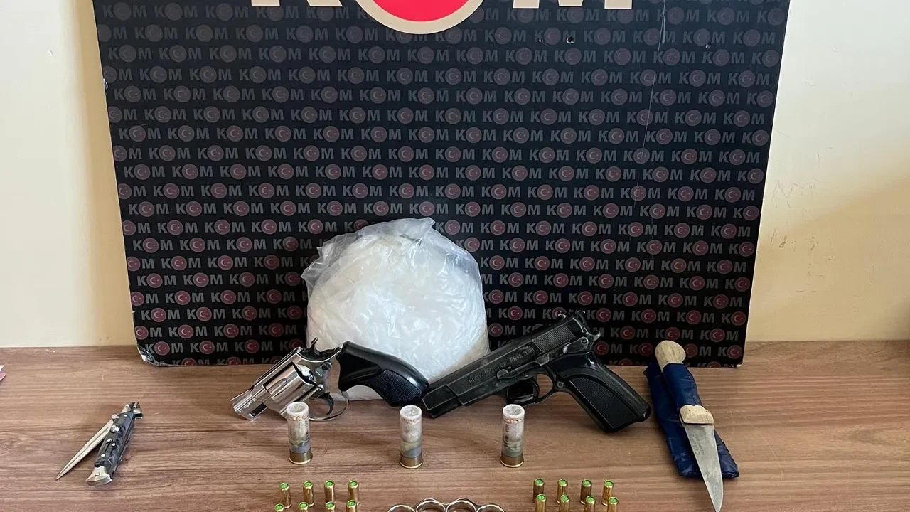 Eş zamanlı baskınlarda 2 muşta, 9 bıçak ve 2 kurusıkı tabanca bulundu. Ayrıca 29 fişek ile 1,6 kg uyuşturucu maddesi yakalandı.