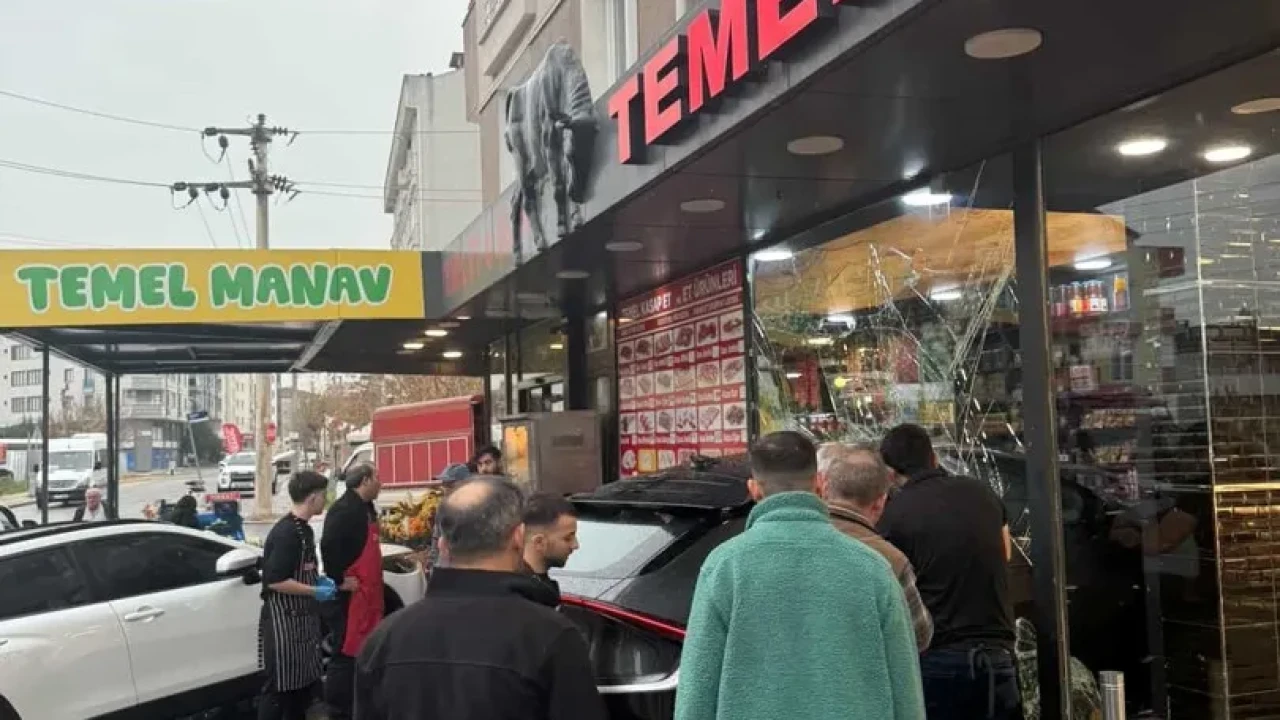 Erdoğan C. idaresindeki araç sürücüsünün kontrolü kaybetmesiyle şarküterinin camını kırarak içeri daldı. Güvenlik kamerasına yansıyan anlarda, kapı önündeki müşteri son anda aracın altında kalmaktan kurtuldu.