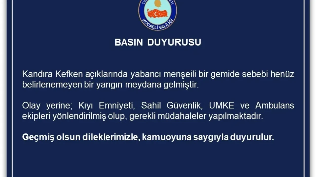Karadeniz'de Kefken açıklarında yabancı menşeli gemide nedeni henüz belirlenemeyen yangın başladı. Kıyı Emniyeti, Sahil Güvenlik, UMKE ve ambulans ekipleri olay yerine yönlendirildi.