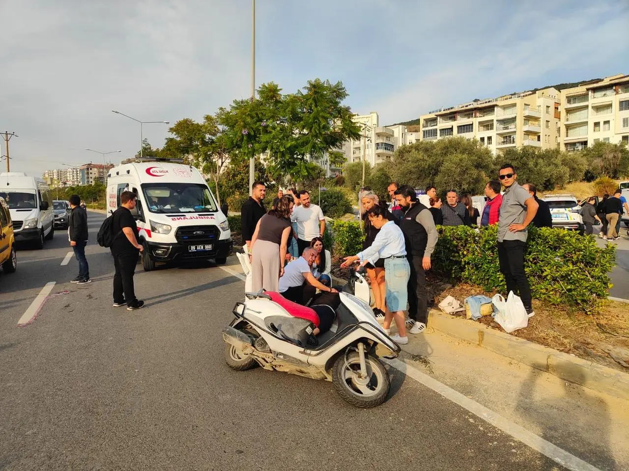 Kuşadası'nda motosikletin çarptığı kadın ağır yaralandı, kaza anı güvenlik kamerasına yansıdı.