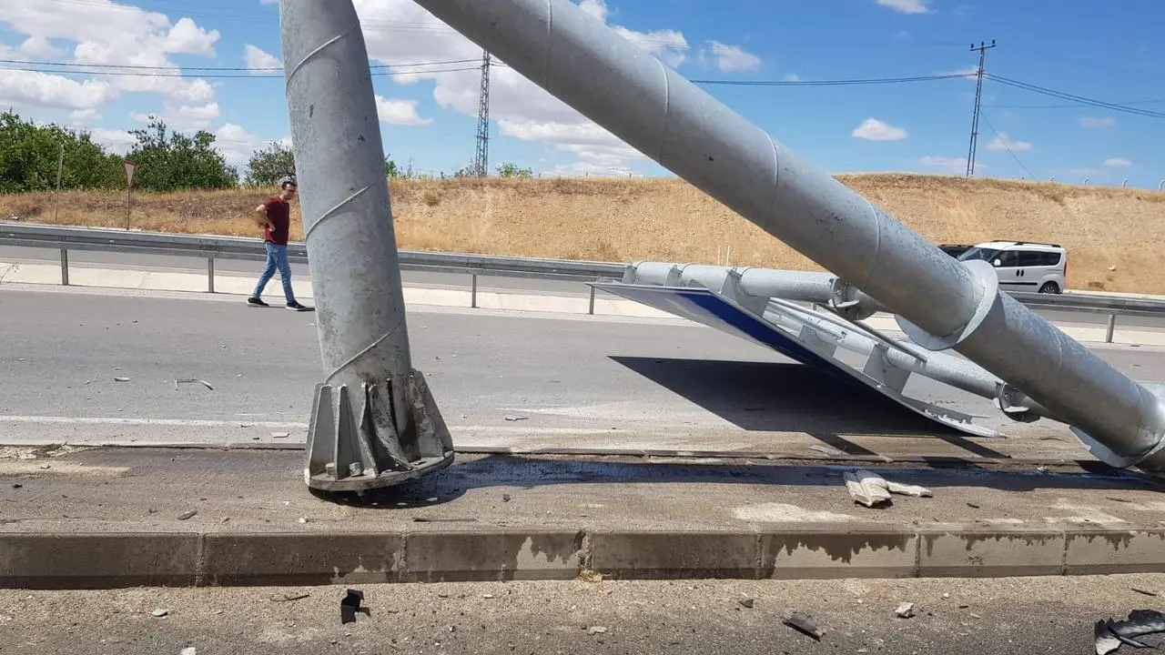 Çarpmanın şiddetiyle yol kenarındaki yön tabelası yerinden söküldü. Kamyon sürücüsü kazada çeşitli yerlerinden yaralandı.