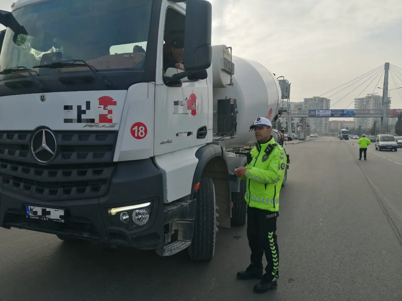 Malatya'da beton mikserleri ve hafriyat kamyonlarına yönelik dron destekli trafik denetimleri devam ediyor.