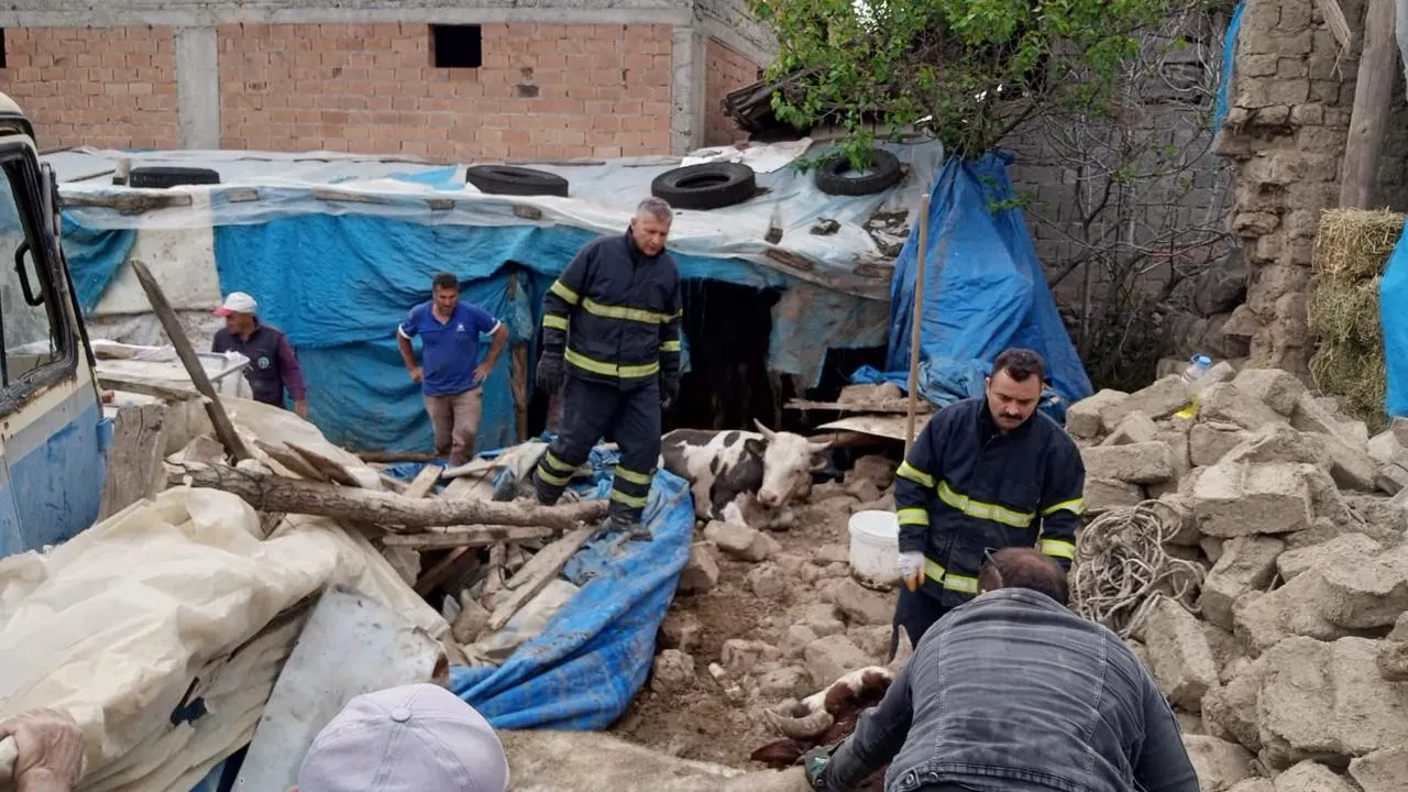 Eyüp Kılıç'a ait kerpiç ahırın tavan kısmında ani çökme yaşandı. Olayda iki büyükbaş hayvan göçük altında mahsur kaldı.