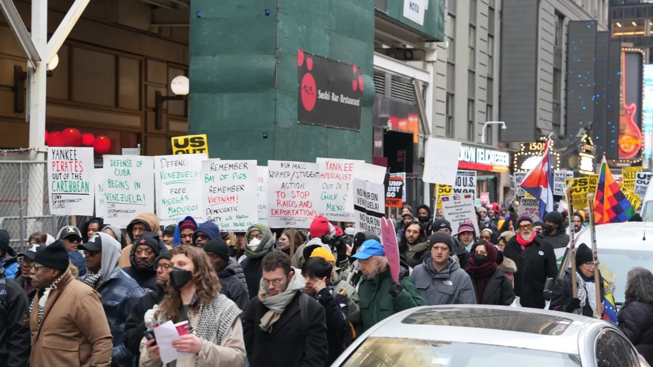 Times Meydanı'nda toplanan kalabalık, ABD yönetiminin Venezuela politikasını kınadı. Protestocular, askeri operasyonların derhal durdurulmasını talep etti.