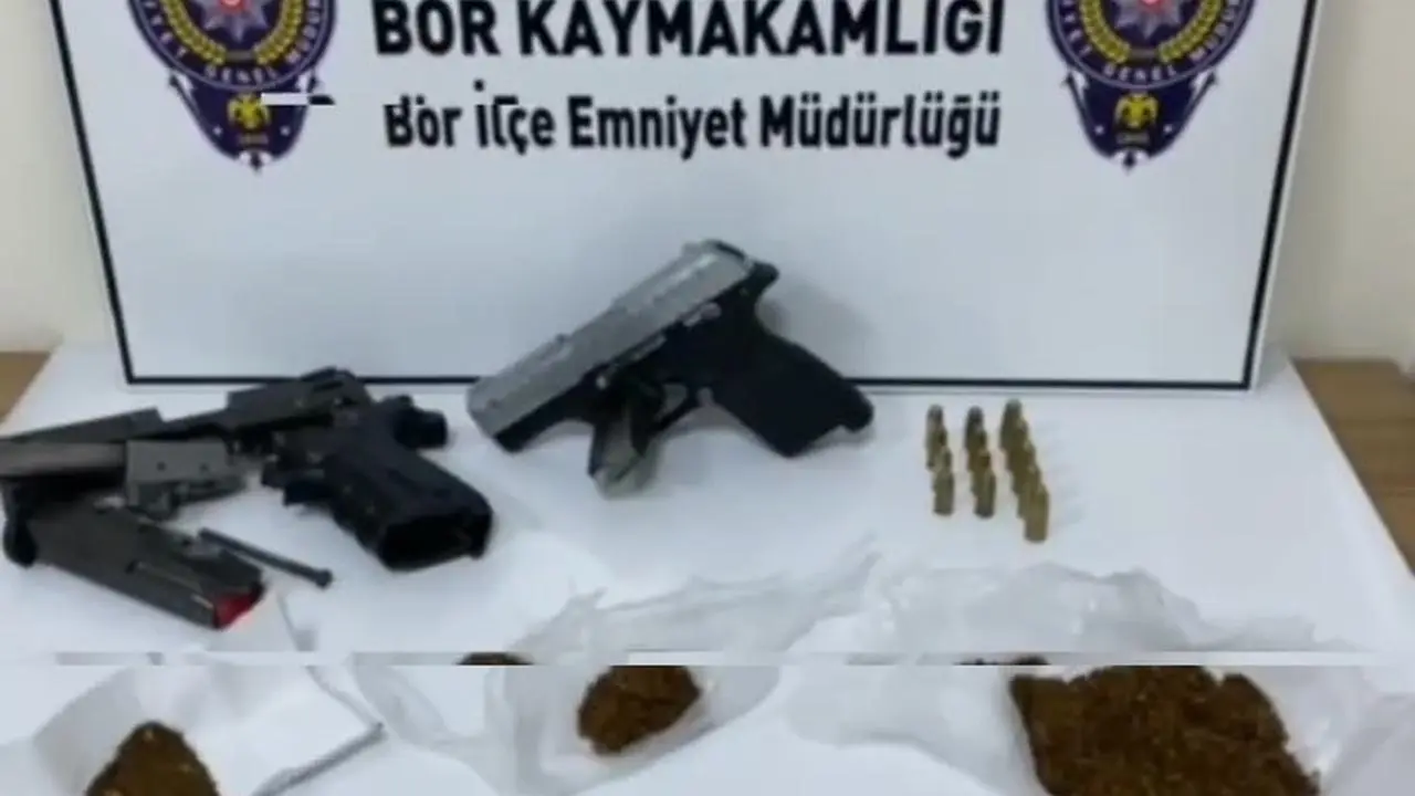 Yapılan aramada iki tabanca ve uyuşturucu madde bulundu. Şüphelinin yanında 13 fişek ve kullanım aparatları ele geçirildi.