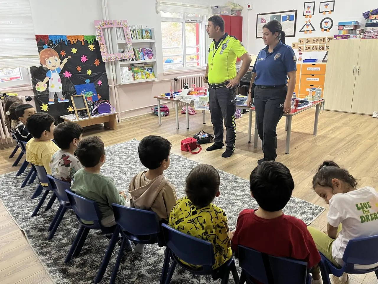 Eğitim kapsamında teorik bilgiler paylaşılırken, öğrenciler merak ettikleri soruları sorma fırsatı buldu. Polisler, görevlerini ve tecrübelerini miniklerle paylaşarak bilinçlendirme sağladı.