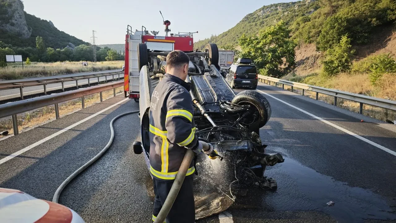 Osmangazi Tüneli çıkışında kontrolden çıkan hafif ticari araç beton bariyere çarptı. Araç takla atarak trafiği kilitledi.