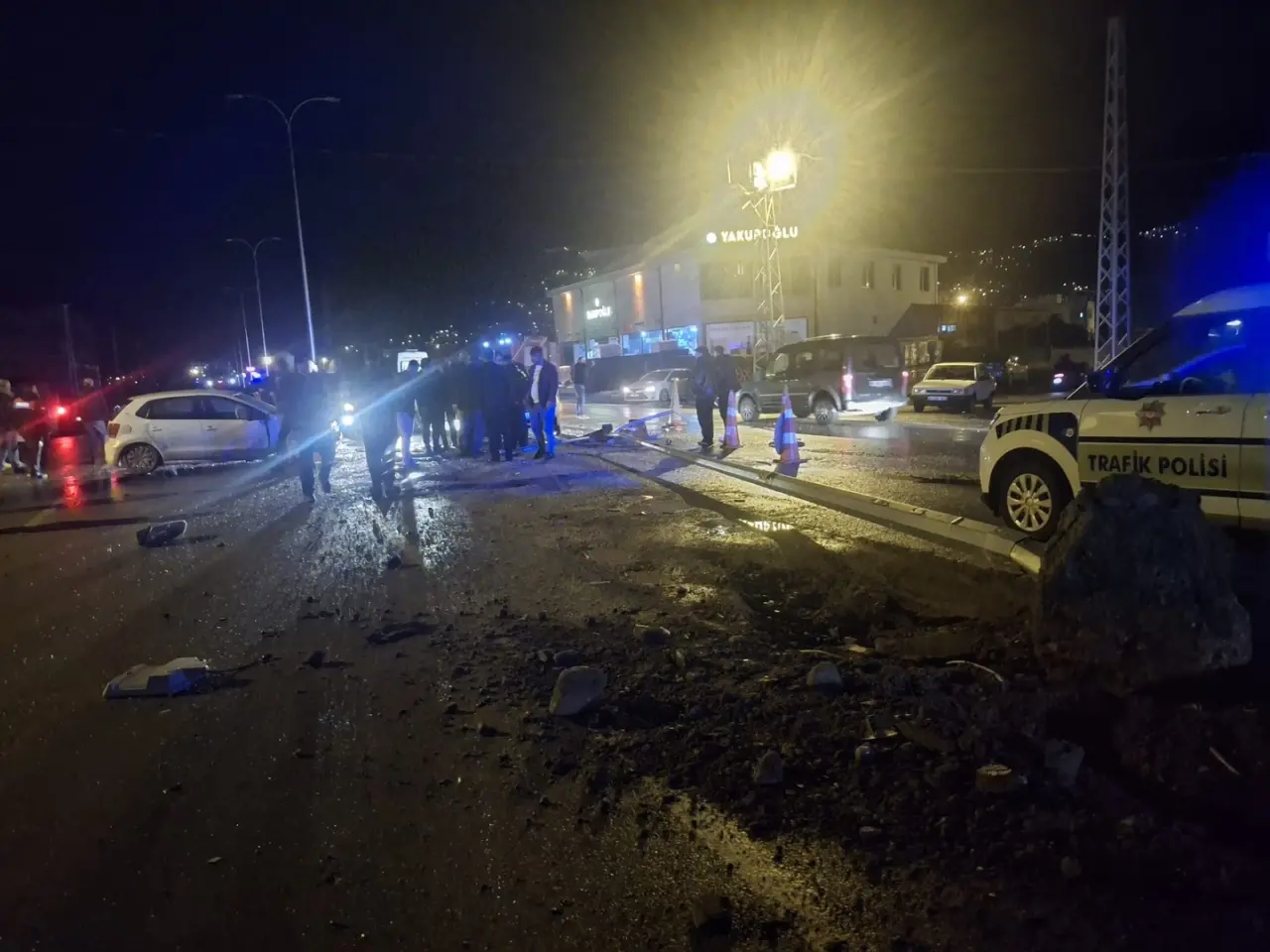 Çarpışmanın etkisiyle savrulan araçlar, refüjdeki aydınlatma direğine çarptı ve durdu. Devrilen direk nedeniyle yol kısa süreliğine trafiğe kapatıldı.