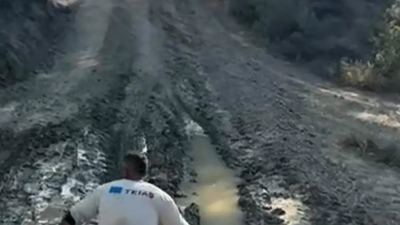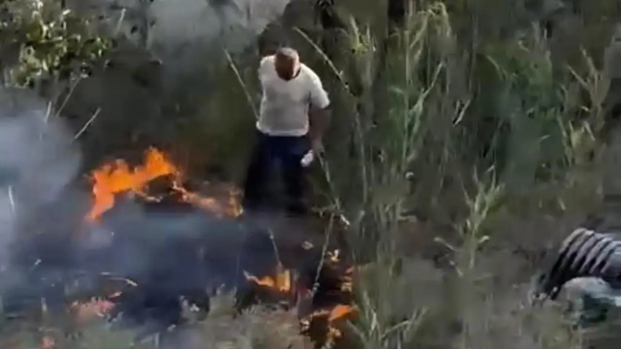 Yangın bölgesine gelen vatandaş çukurda biriken suyu pet şişeyle topladı. Defalarca su taşıyarak alevlere müdahale etmeye çalıştı.