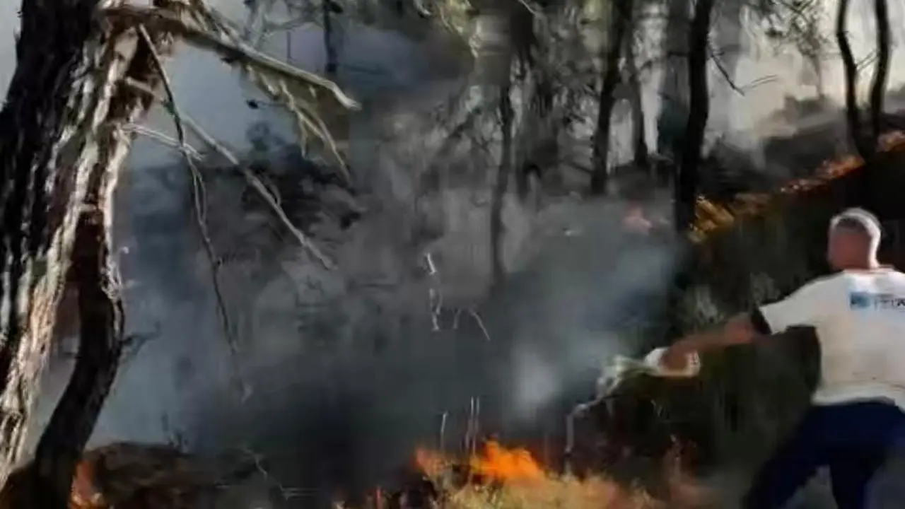 Sakarya'nın Geyve ilçesinde çıkan orman yangınında bir vatandaş, pet şişeyle alevlere karşı mücadele verdi.