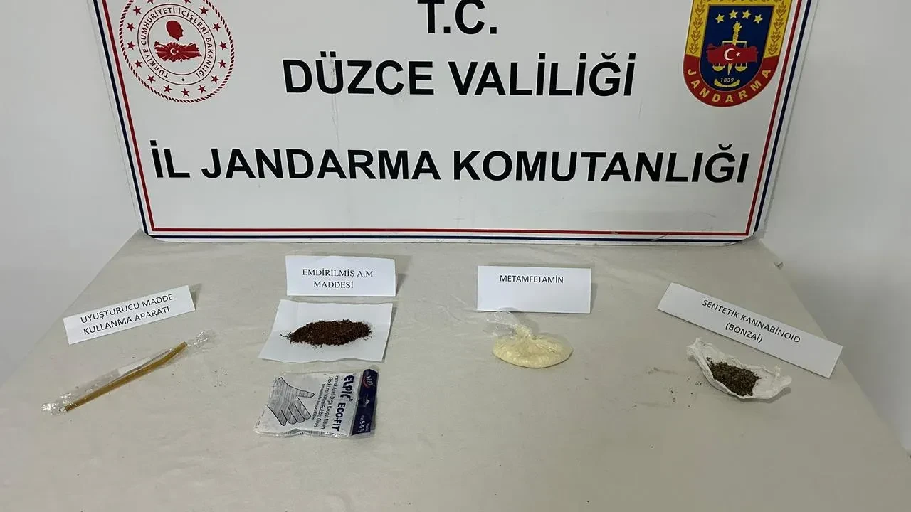 Düzce İl Jandarma ekipleri, Sakarya'dan uyuşturucu getiren şüpheliyi yakalayarak çok miktarda metamfetamin ve bonzai ele geçirdi.