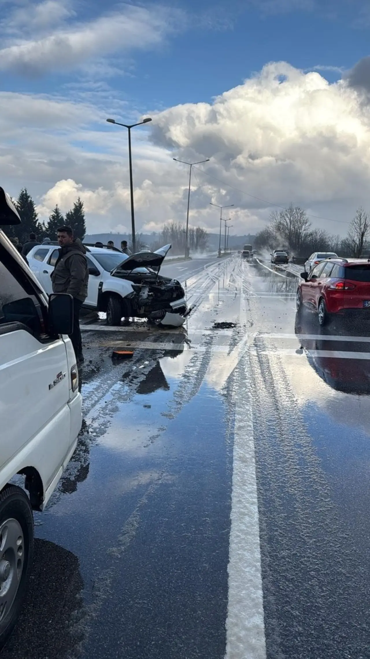 Sakarya'da yağış nedeniyle kayganlaşan yolda kontrolden çıkan araç refüjdeki tabelaya çarptı. Kazada yaralanan olmadı.