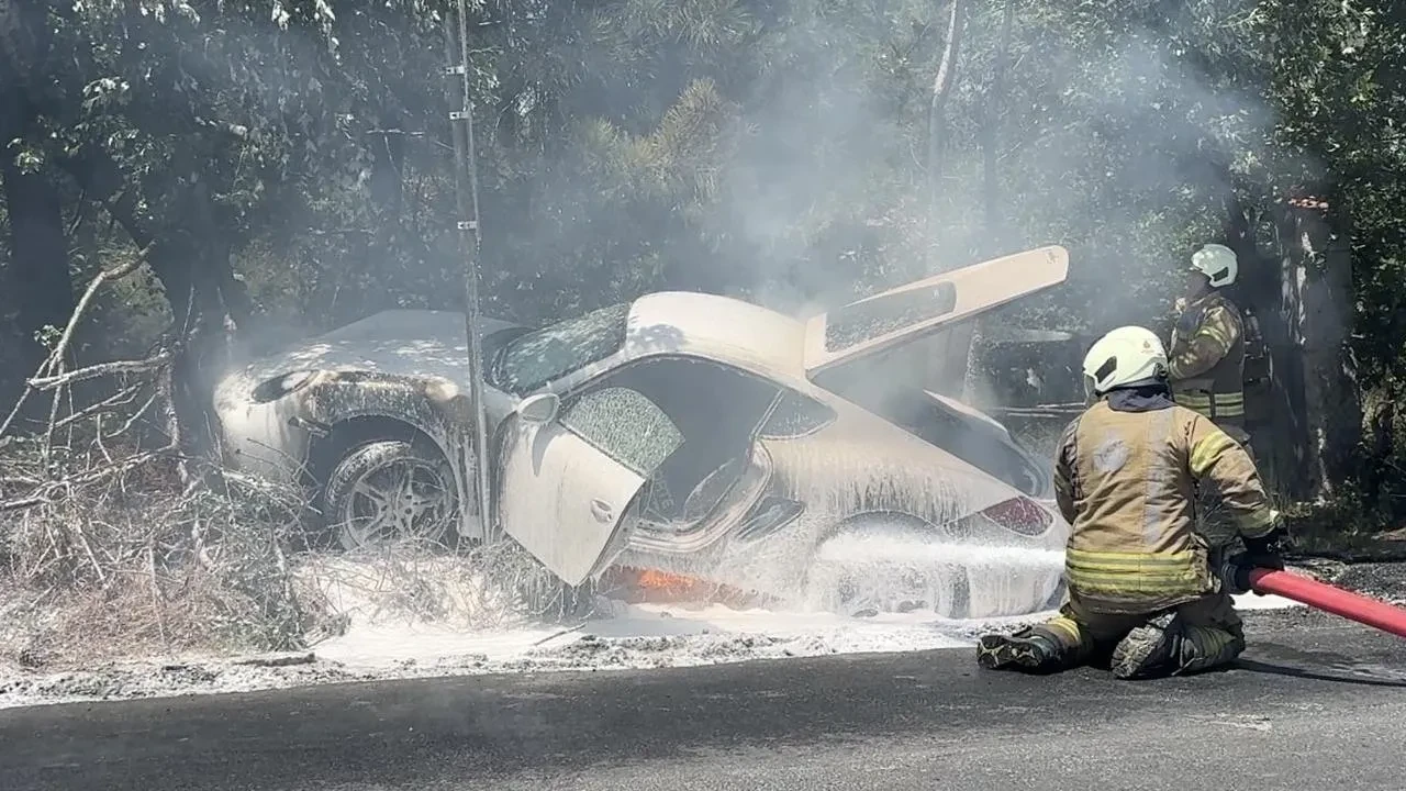 Sarıyer'de seyir halindeki Porsche marka otomobil, kontrolden çıkarak yeşil alana savruldu ve alev aldı.