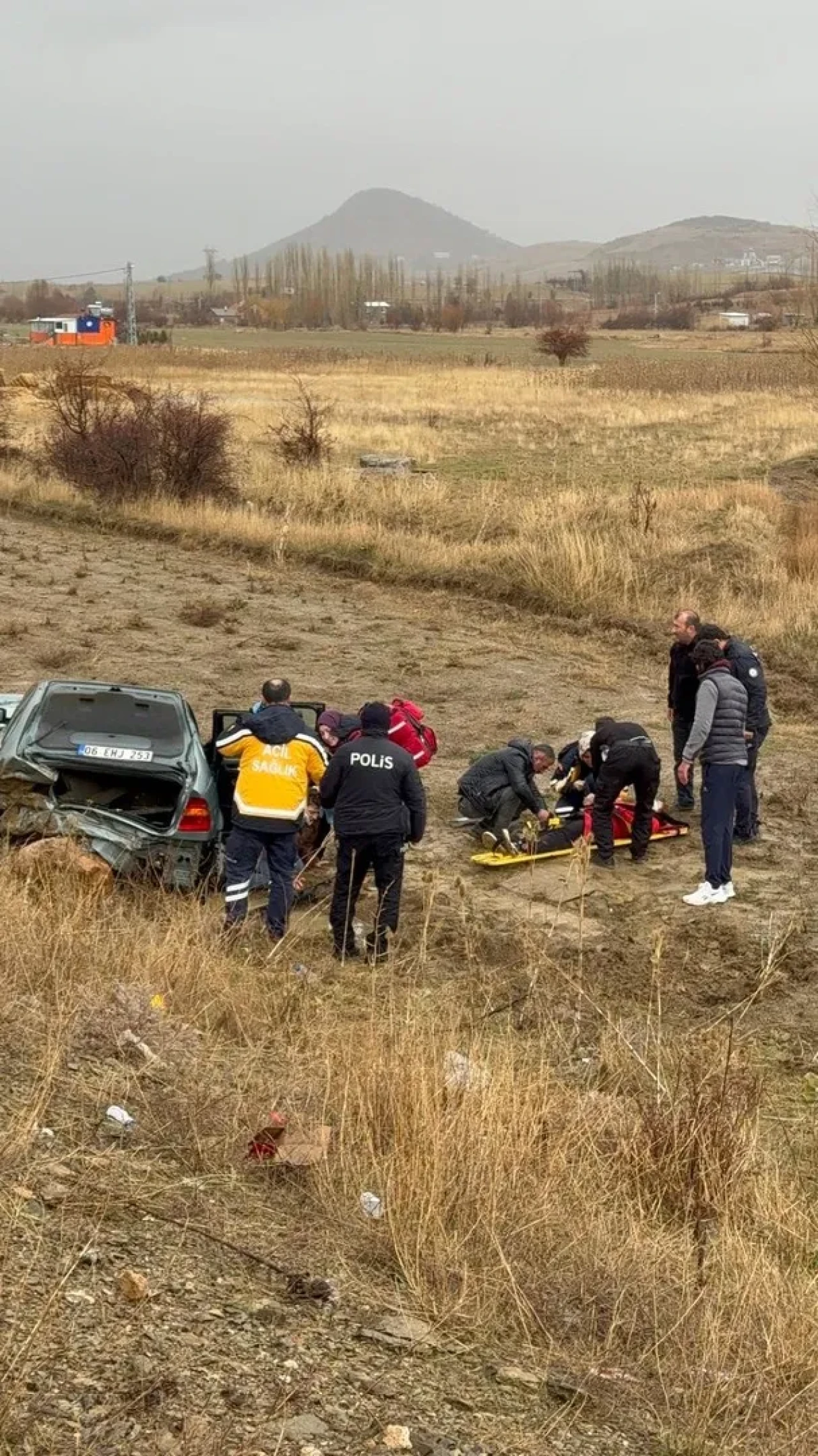 Kazada sürücü ile yolculardan ikisi yaralandı. Sağlık ekipleri gelene kadar bir vatandaş yaralıların ıslanmaması için şemsiye tuttu.
