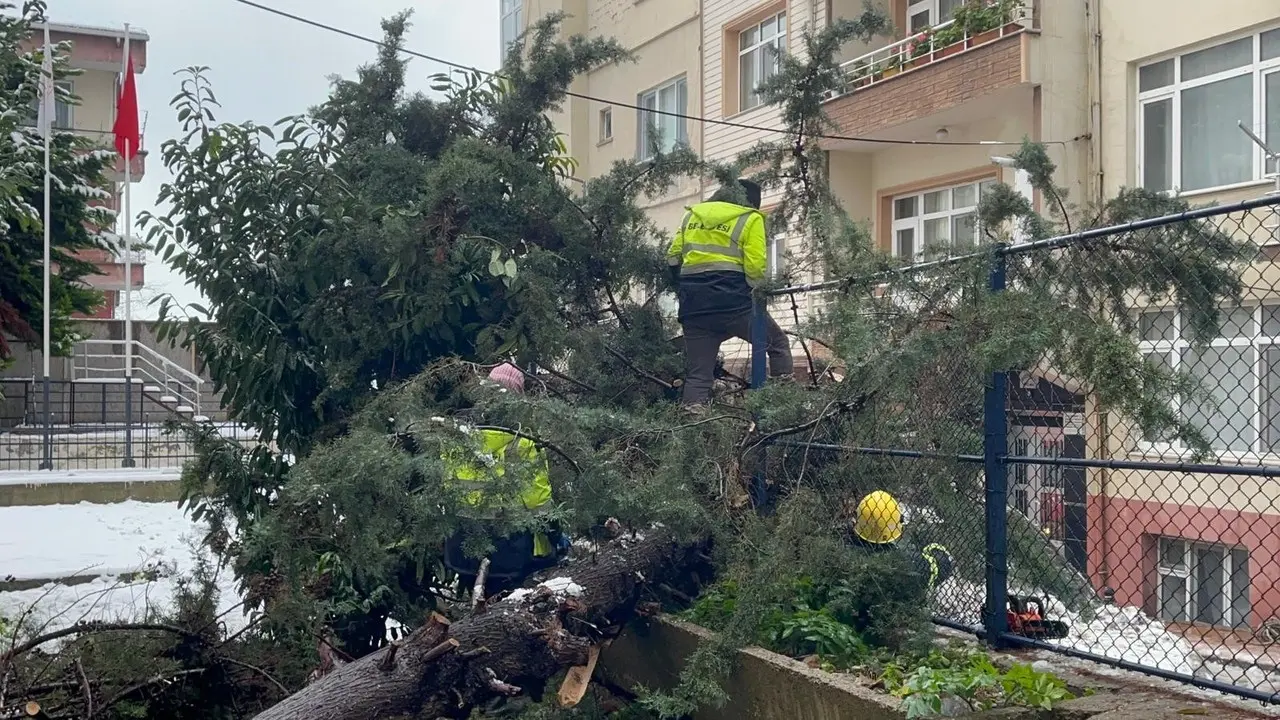 Devrilen ağaç, bahçe bariyerlerini aşarak yola ulaştı. Yol kenarında park halindeki hafif ticari aracın üzerine düştü.