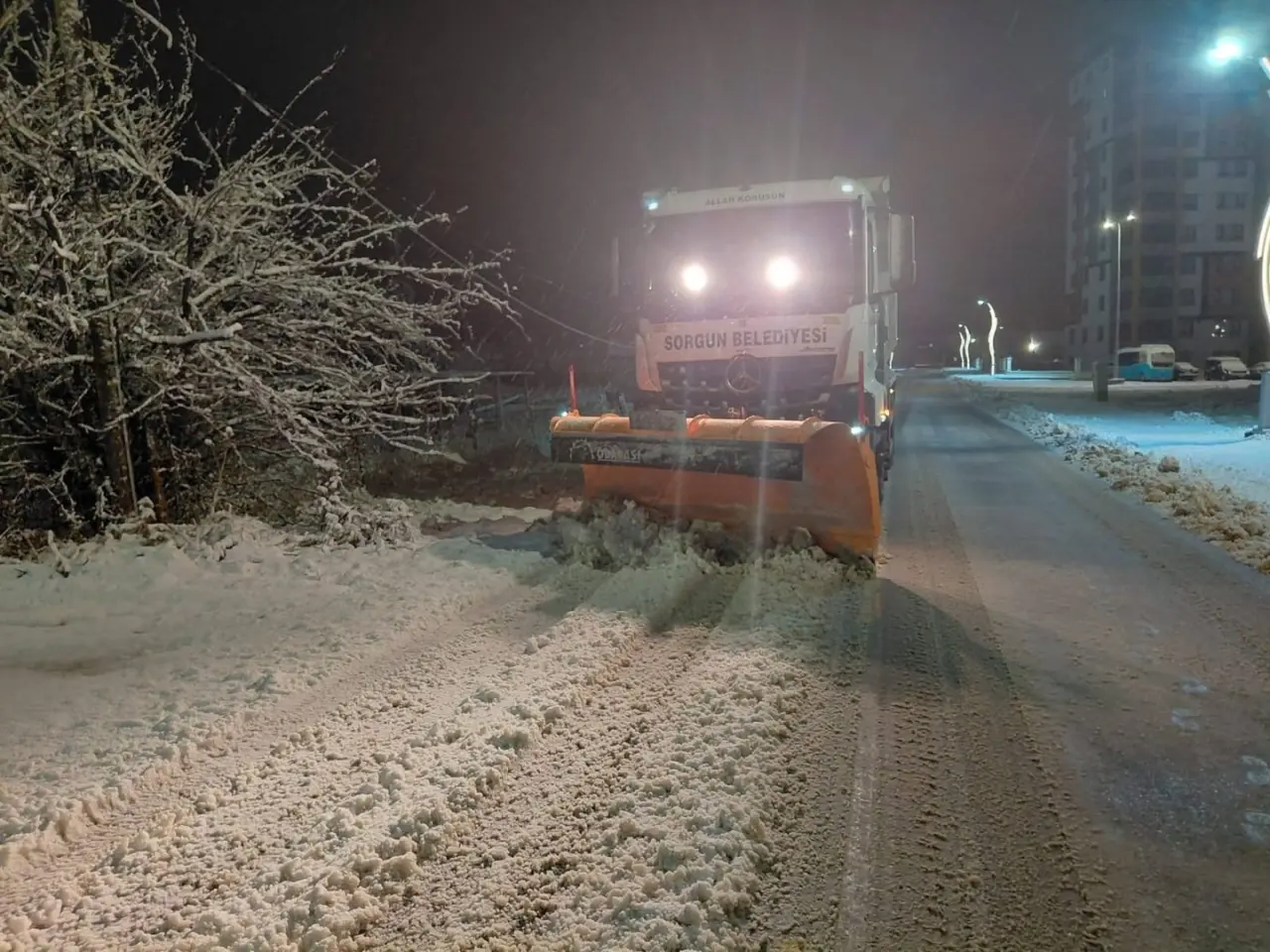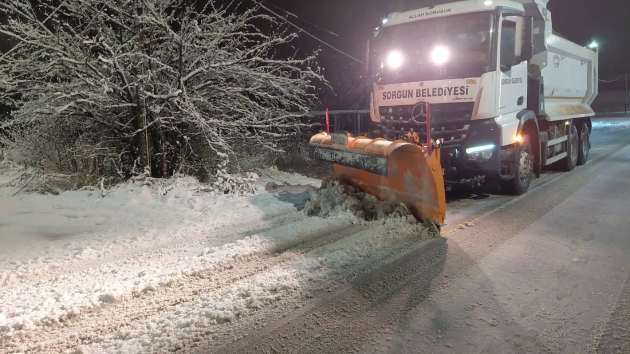 Sorgun Belediyesi ekipleri, gece başlayan kar yağışı nedeniyle sabahın ilk saatlerinde sahaya indi. Kar küreme ve tuzlama çalışmalarıyla ulaşımın kesintiye uğramaması için yoğun çaba harcandı.